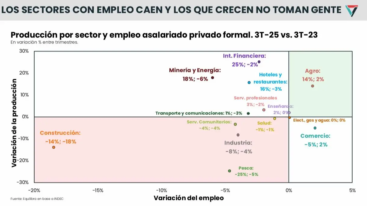 A partir de este año comenzará a verse en las estadísticas una disociación entre crecimiento del PBI y generación de empleo que no tiene antecedentes en el país. El fenómeno se explica porque los sectores que más se expanden -hidrocarburos, minería, agro e intermediación financiera- tienen una baja capacidad de generación de puestos de trabajo. “La economía crece, pero se destruye el buen empleo”, señala el informe de la consultora Equilibra, acompañado por un gráfico que muestra el aumento de la producción en paralelo con la caída mensual del empleo formal de calidad. En contrapartida, los sectores más intensivos en mano de obra -como la pesca, la construcción, la industria y el comercio- exhiben retrocesos.
