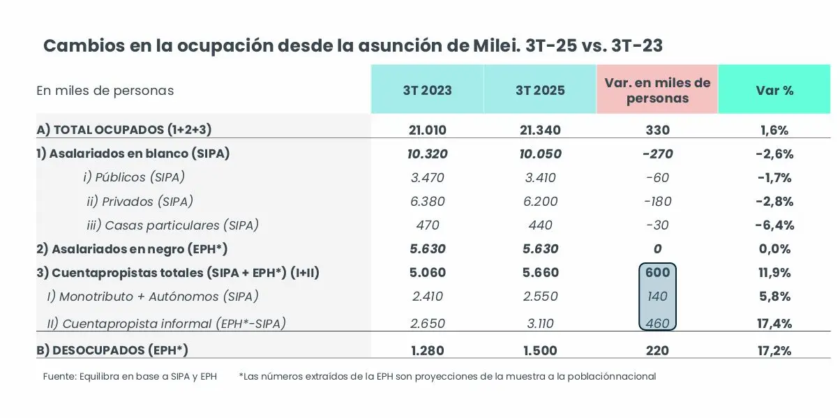 La comparación entre el tercer trimestre de 2023 y el de 2025 muestra con claridad esa pérdida de empleo de calidad, que es reemplazado por modalidades más precarias como el monotributo y el trabajo por cuenta propia. Mientras se registró una caída de unos 270.000 puestos de asalariados en blanco, el número de cuentapropistas creció en alrededor de 600.000. El resultado es una aparente baja de la desocupación que, en los hechos, encubre un proceso de pauperización del mercado laboral y de deterioro del empleo tal como se lo conocía en la Argentina.